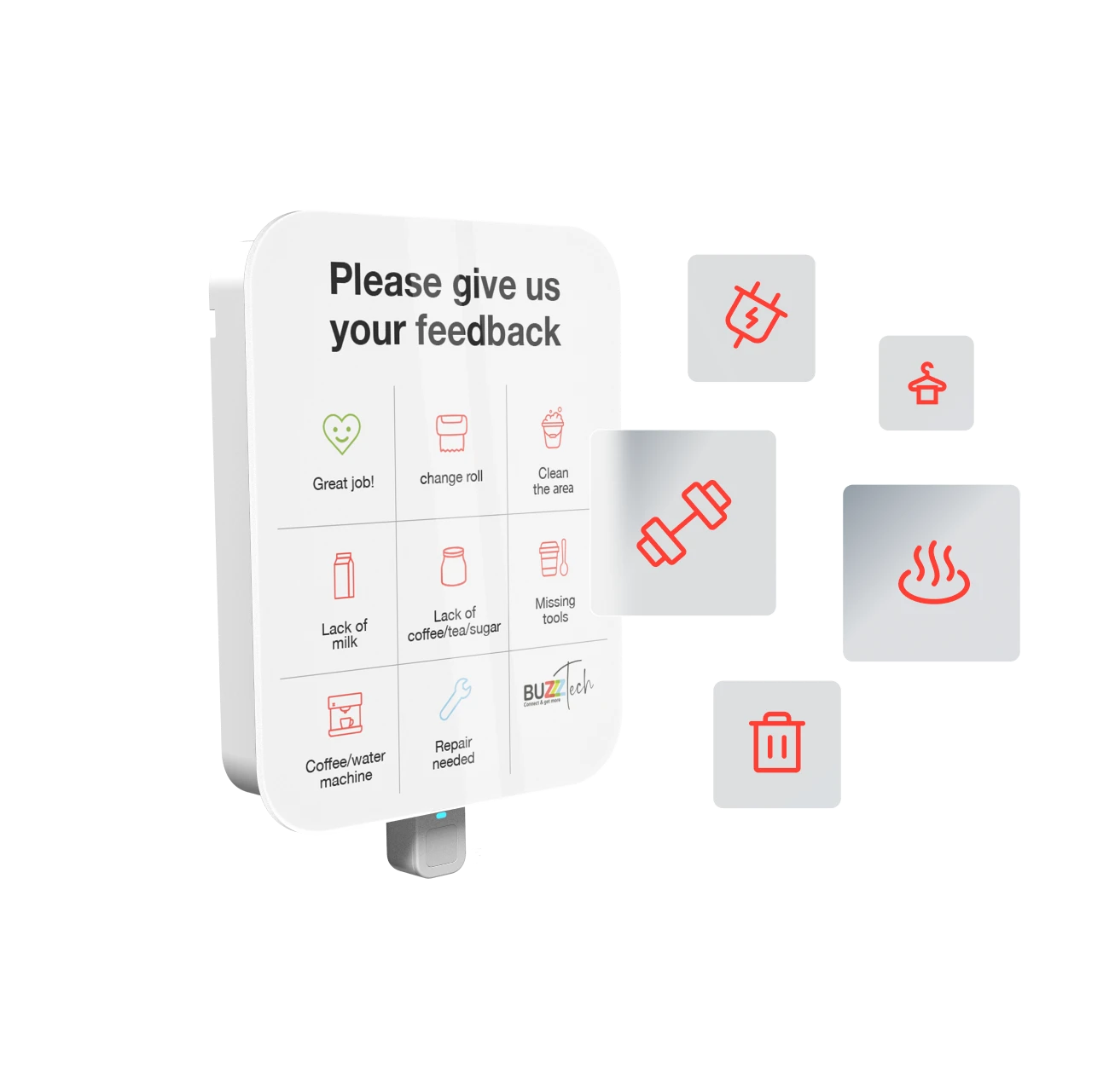 Meet a variety of interactions. Station installed at the exit door of the washroom facility, the kitchenette or board rooms, containing buttons that indicate specific shortages.